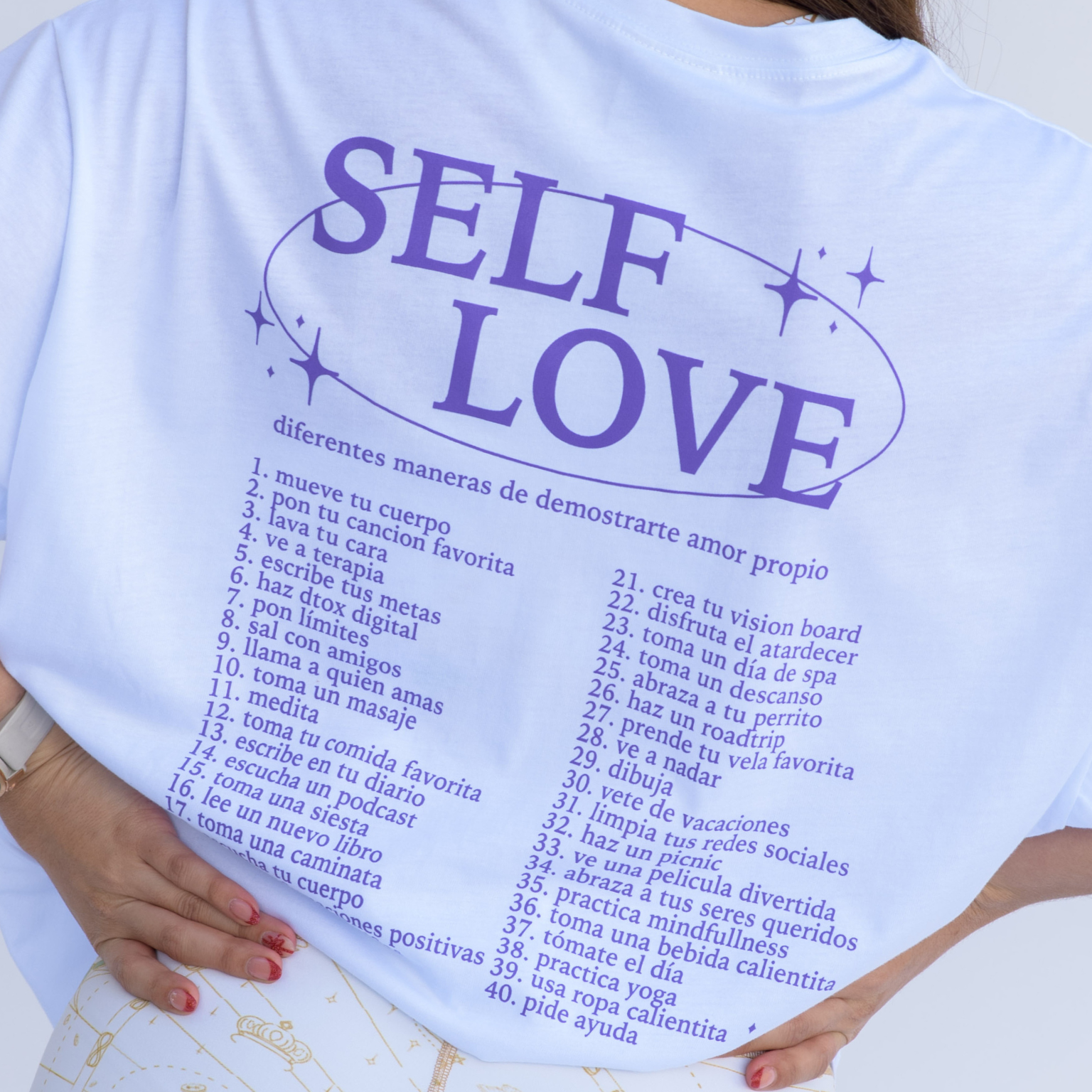 Libera la magia del Self Love con nuestra T-Shirt Oversize Blanca y descubre 40 maneras de demostrarte amor.